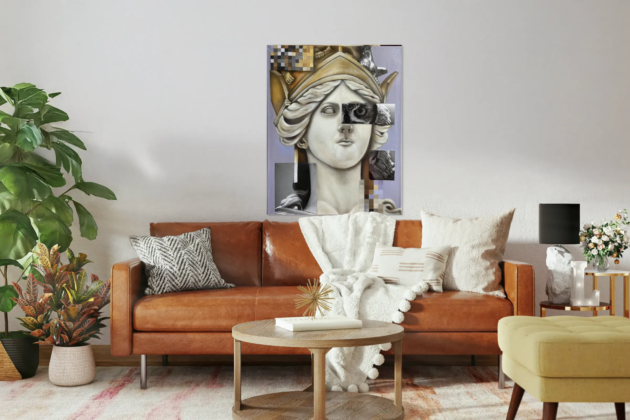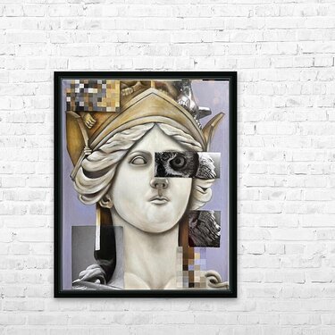 Veronika Otcuoglu (she/her), is a visual artist based in Montreal. She specializes in painting and drawing. In her practices, she pays attention to the use of cultural elements from her hometown Turkey and symbolic elements inspired by her origins; the art, the history, mythological motifs and the political issues of this country. Her art style is mostly realistic but she likes mixing the styles and different artistic techniques such as combining surrealistic figures, objects and ideas with realistic ones. She is working on different themes such as nostalgia, culture, landscapes, portraits, and abstract compositions relating to Turkey. She has done an apprenticeship in The Visual Arts Centre of Westmount before starting her undergraduate studies. She has recently graduated from the extended program of the Painting and Drawing Department at Concordia University’s Faculty of Fine Arts. Artwork description: Equity is a mixed-media painting that explores the complex nature of justice and its importance in a society. In my work, as an Armenian-Greek born in Turkey, I wanted to challenge the concept of having lived in a country where justice is lacking. This painting is a representation of Athena, the goddess of wisdom, war, handicrafts, peace and especially of justice and victory. I feel a deep connection to the Athena archetype. She is also known as Nike, as my name, Veronika, which means 'bringing victory.' The work blends the softness of the brush strokes and the sharp-cut rectangular and square forms. The achromatic collages, on which parts of Athena’s statue and owl (symbol of wisdom) are depicted, create a contrast with the gold, warm colours. The pixelated effects created turn it into a blurry image in some areas of the painting, which refers to the unclear historical facts of the past.