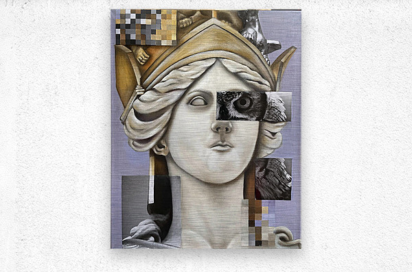Equity est une peinture en techniques mixtes qui explore la nature complexe de la justice et son importance au sein de la société. Dans mon travail, en tant que personne arméno-grecque née en Turquie, j’ai voulu remettre en question le fait d’avoir vécu dans un pays où la justice fait défaut. Cette peinture représente Athéna, déesse de la sagesse, de la guerre, de l’artisanat, de la paix et, surtout, de la justice et de la victoire. Je ressens une profonde connexion avec l’archétype d’Athéna. Elle est aussi connue sous le nom de Niké, tout comme mon prénom, Veronika, qui signifie « porteuse de victoire ». L’œuvre mélange la douceur des coups de pinceau et les formes rectangulaires et carrées aux découpes nettes. Les collages achromatiques, représentant des parties de la statue d’Athéna et une chouette (symbole de sagesse), créent un contraste avec les couleurs dorées et chaudes. Les effets pixélisés produisent une image floue par endroits, ce qui fait référence aux faits historiques du passé encore flous ou non clarifiés. ______________________________________________