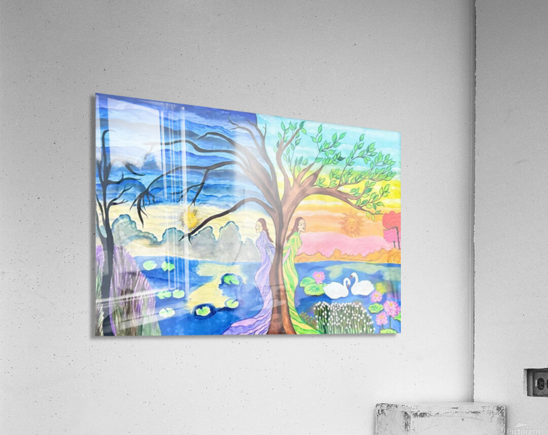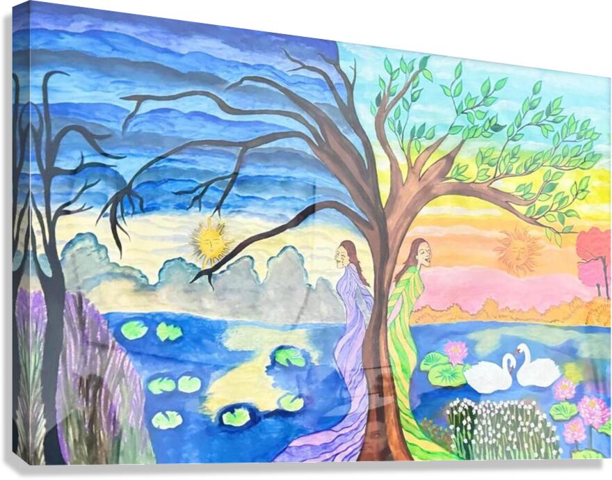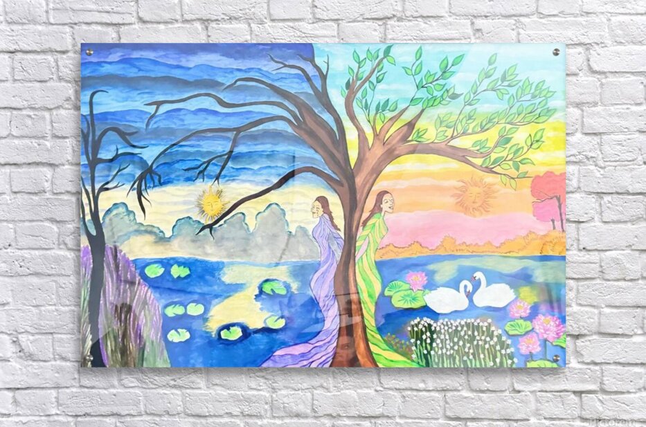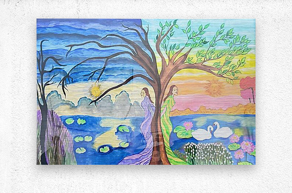 Cette œuvre explore la dualité émotionnelle d’une femme à travers le contraste entre les saisons d’hiver et d’été. D’un côté, les tons froids de bleu et de violet de l’hiver l’enveloppent dans une solitude propice à l’introspection ; les branches nues et le ciel sombre évoquent la tristesse ou la réflexion. En opposition, le côté estival rayonne de chaleur avec des verts vifs, des roses et des teintes dorées, symbolisant la joie, la croissance et la paix intérieure. L’arbre reliant les deux moitiés incarne la résilience — un rappel que les émotions sont changeantes mais intimement liées. Cette pièce invite le spectateur à embrasser l’équilibre entre lumière et obscurité au sein de son propre paysage émotionnel lors des transitions saisonnières.
