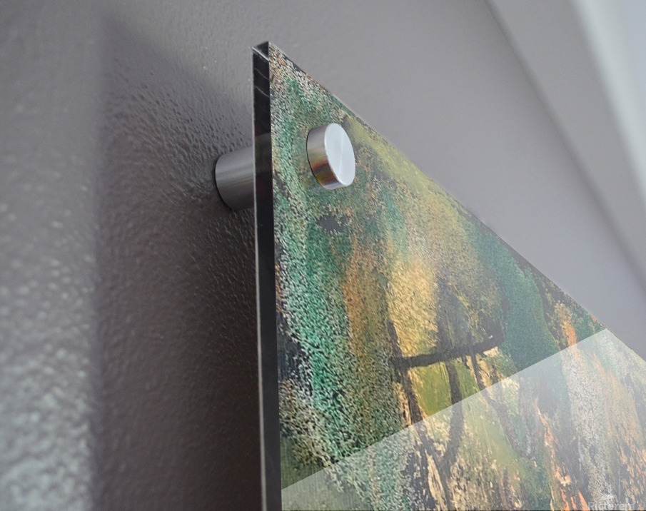 Printed to the edge - Ready to hang - provided with 4 premium polished aluminum stand off ( wall screws and mounting hardware provided ) We suggest a thicker 3/16" acrylic for any size over 42 inches to guarantee a straight acrylic, without curvature