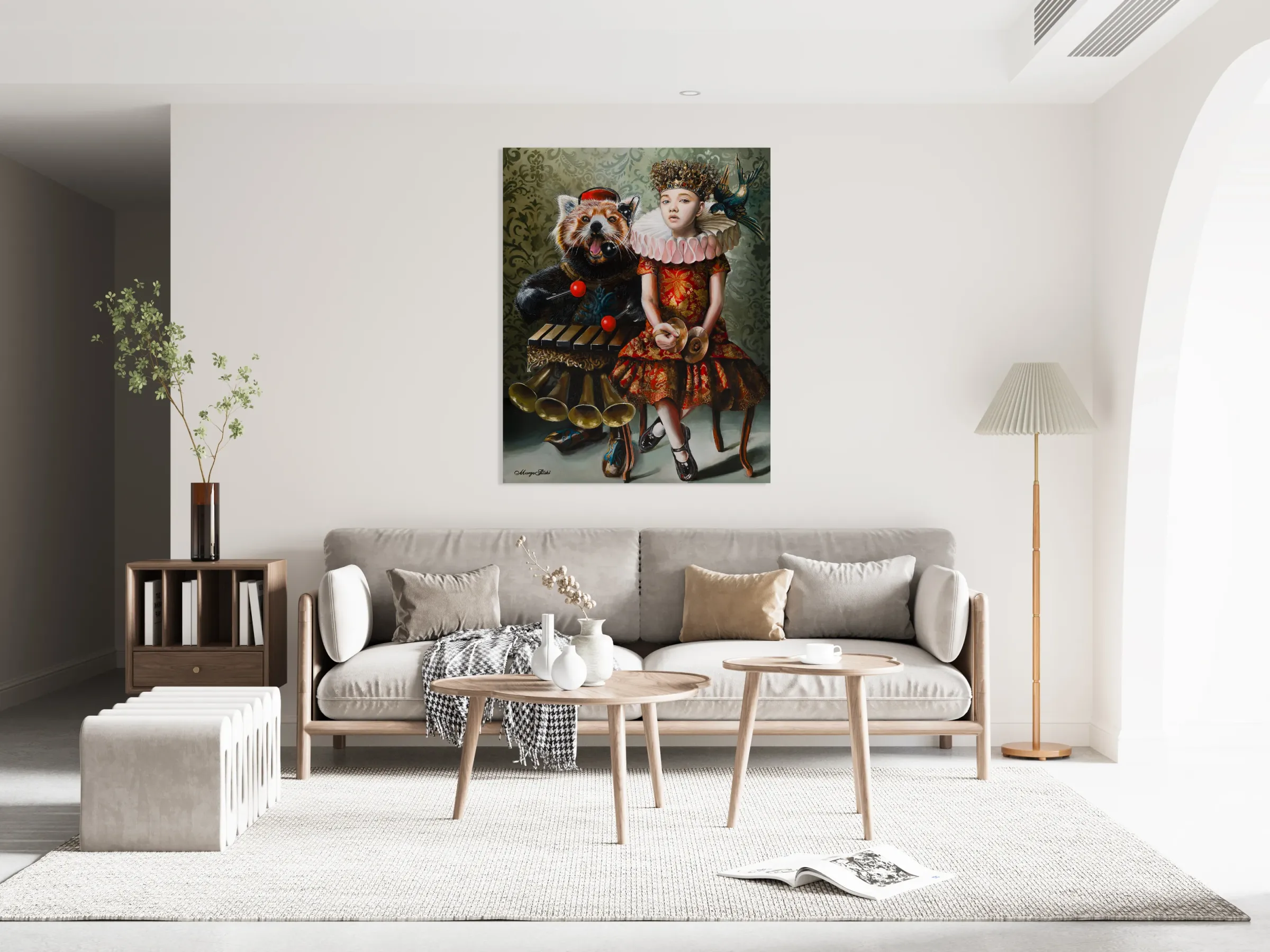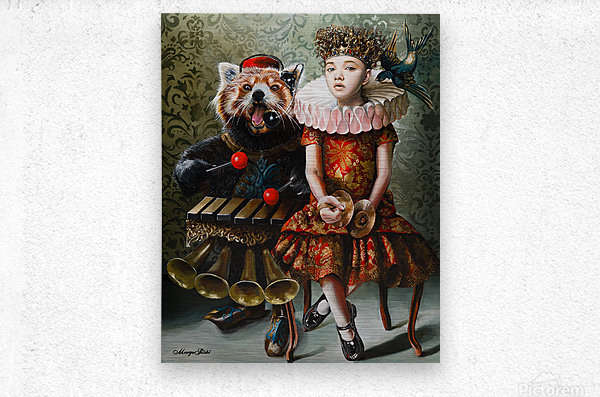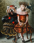 Twin City-based figurative surrealist painter Margo Selski’s large-scale oil paintings lead her viewers on a little trip down the rabbit hole into an imaginary world that is nuanced, sly, quirky, dark, uncanny and fabular. Rooted in the world of fairy tales, she uses a theatrical troupe: queens, young girls, flora and fauna, predator, and prey. They become the raw materials used to invent and examine the tension between opposites-contemporary and classical, old and new, safe and unsafe and discretion and confession. Margo collides old world regal design with 21st century concerns with the intention to examine her life through a mirror at a distance.