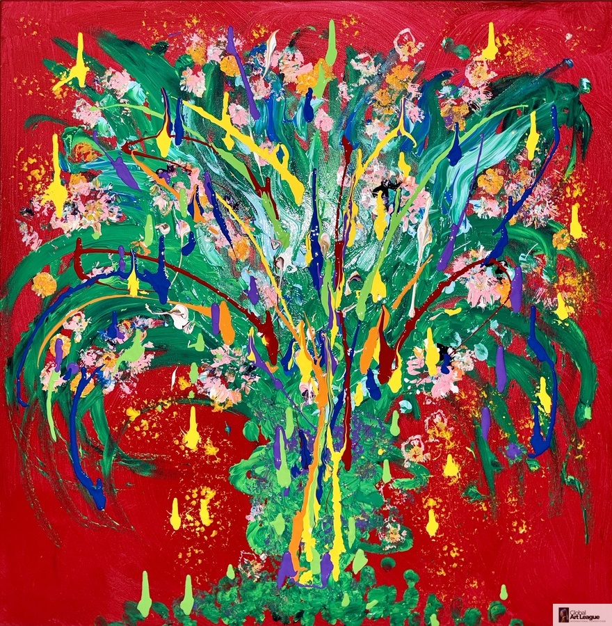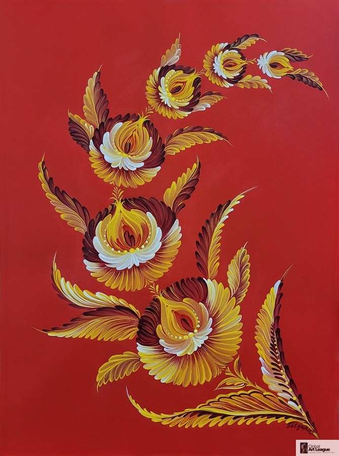 Tetyana Nechyporenko ArtKvitka - Crimson Sky - Petrykivka Style - Acrylic - 12 x 16 par Global Art League [+]